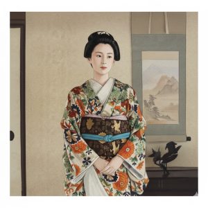 髷を結った頭、お引きずりの裾には綿をふっくら入っていてボリュームがあります。そこで帯幅も広く、帯締も丸ぐけ(綿の入ってふっくら太い)をしています。半衿もさらに大きく出しています。