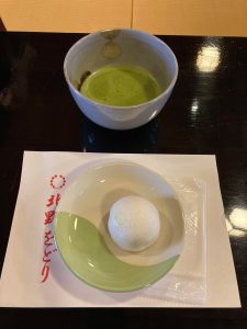 芸妓さんのお手前と舞妓さんを眺めながら、1番前の席でお抹茶をいただきました。